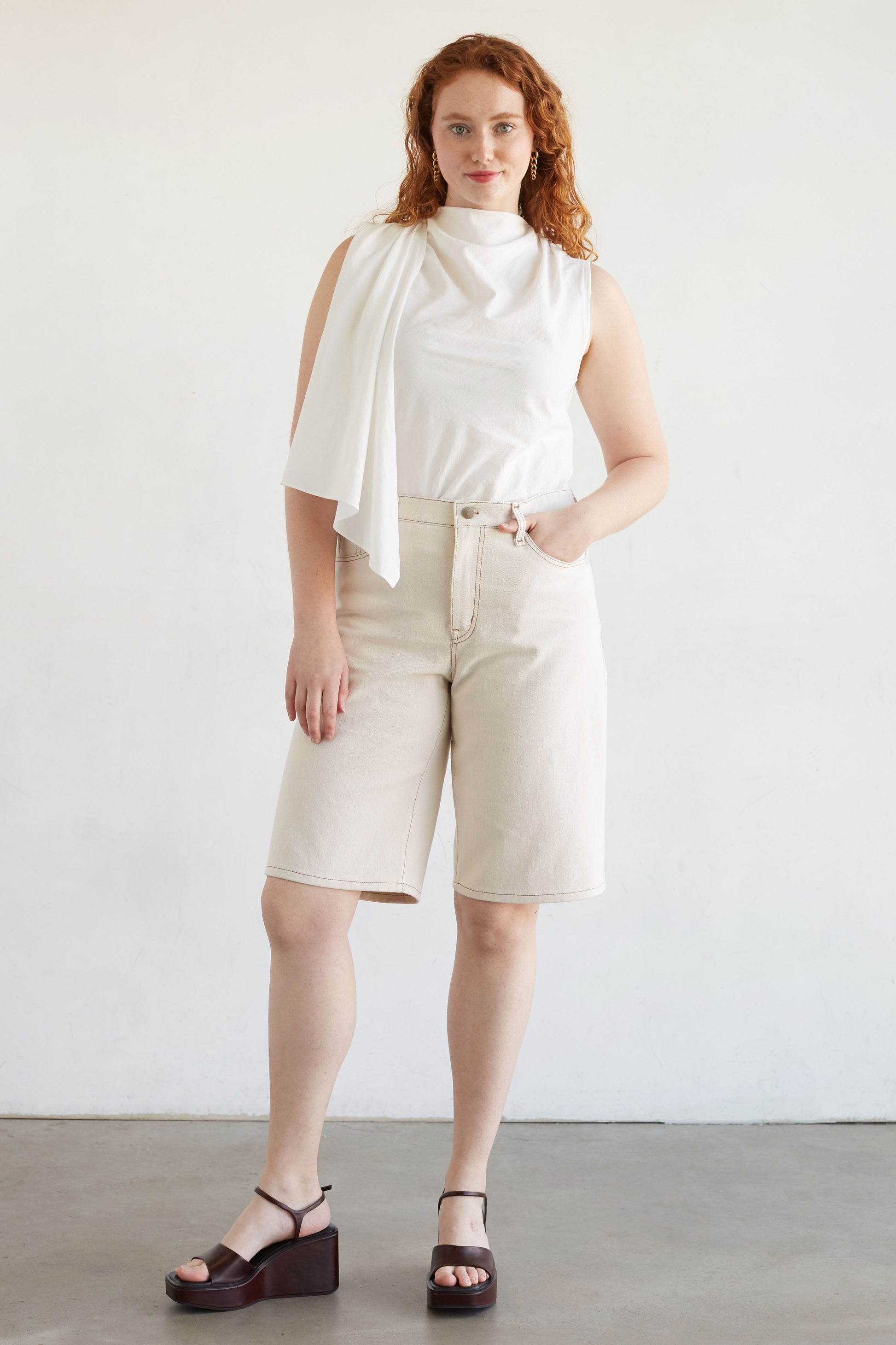 View B is intended to fall just above the knee for that not too short, not too long jean short we’ve all been looking for: aka JORTS. The pattern only comes with one inseam option for View B, so adjust accordingly for your height!